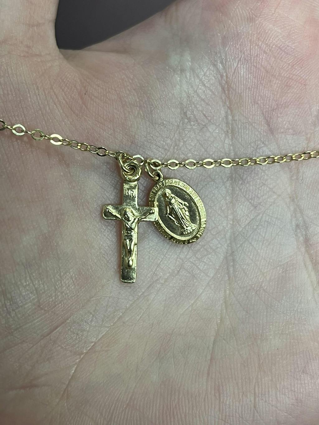 - 14mm x 9mm Miraculous Medal that says: "O Mary conceived without sin pray for us who have recourse to thee."