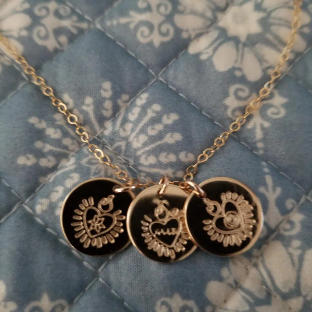 Our Hearts of the Holy Family Necklace includes three hand-stamped discs with images of the Most Chaste Heart of Saint Joseph, the Sacred Heart of Jesus, and the Immaculate Heart of Mary.