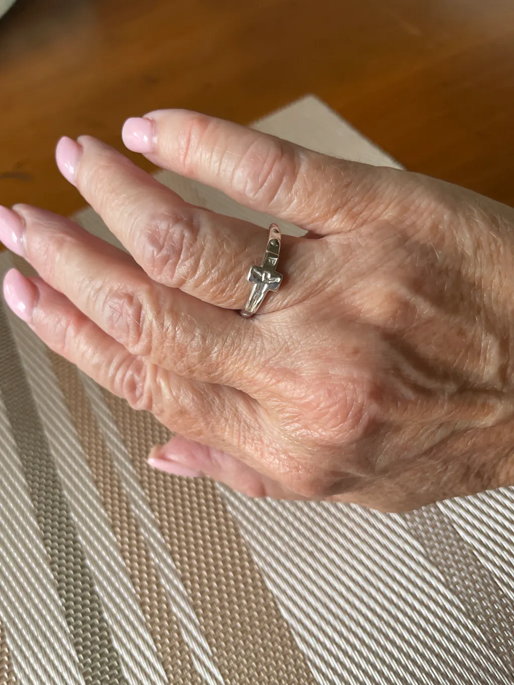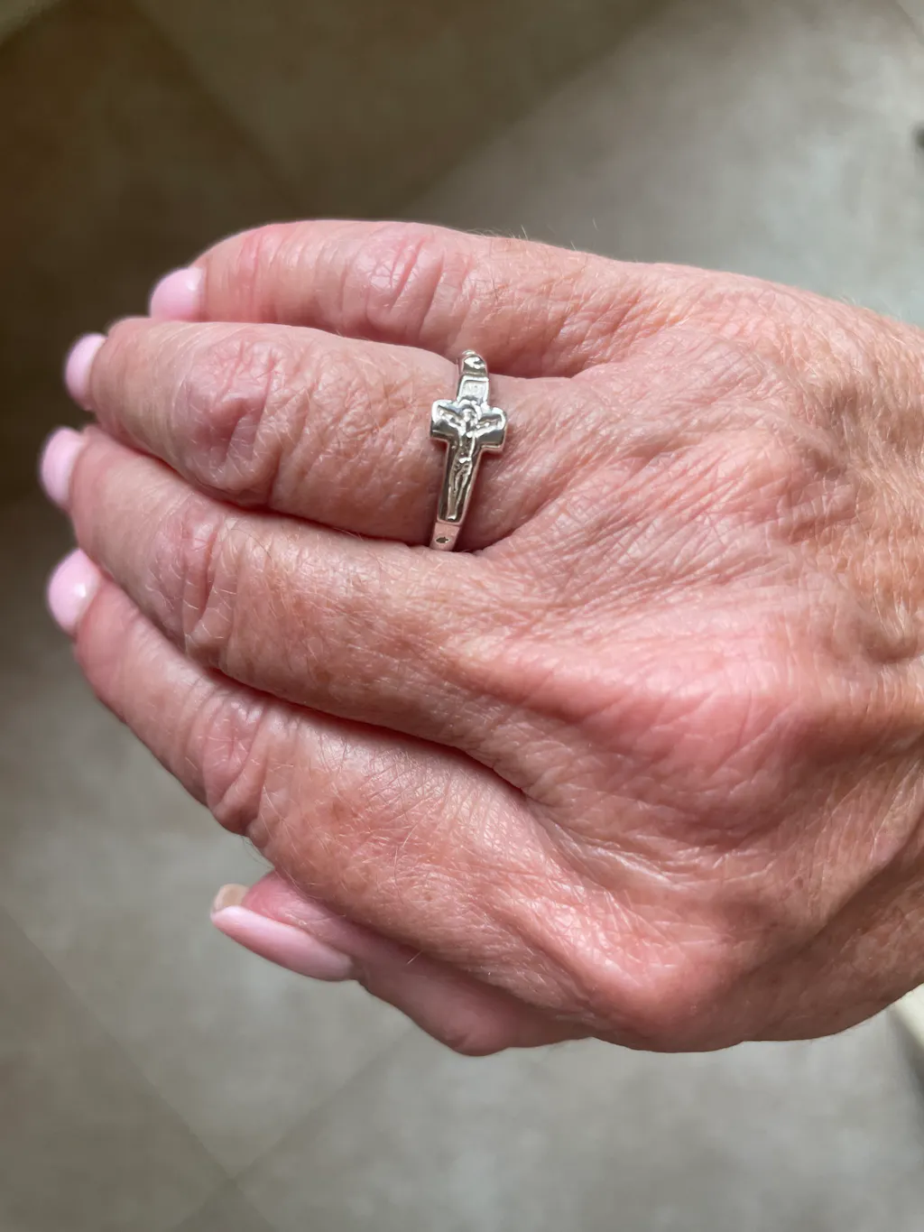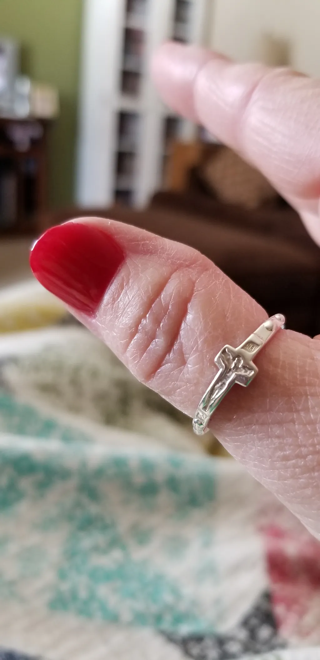 A close-up of a light-skinned hand wearing the Rosary Ring, a sterling silver cross-shaped ring, on the index finger against a soft white fabric background.