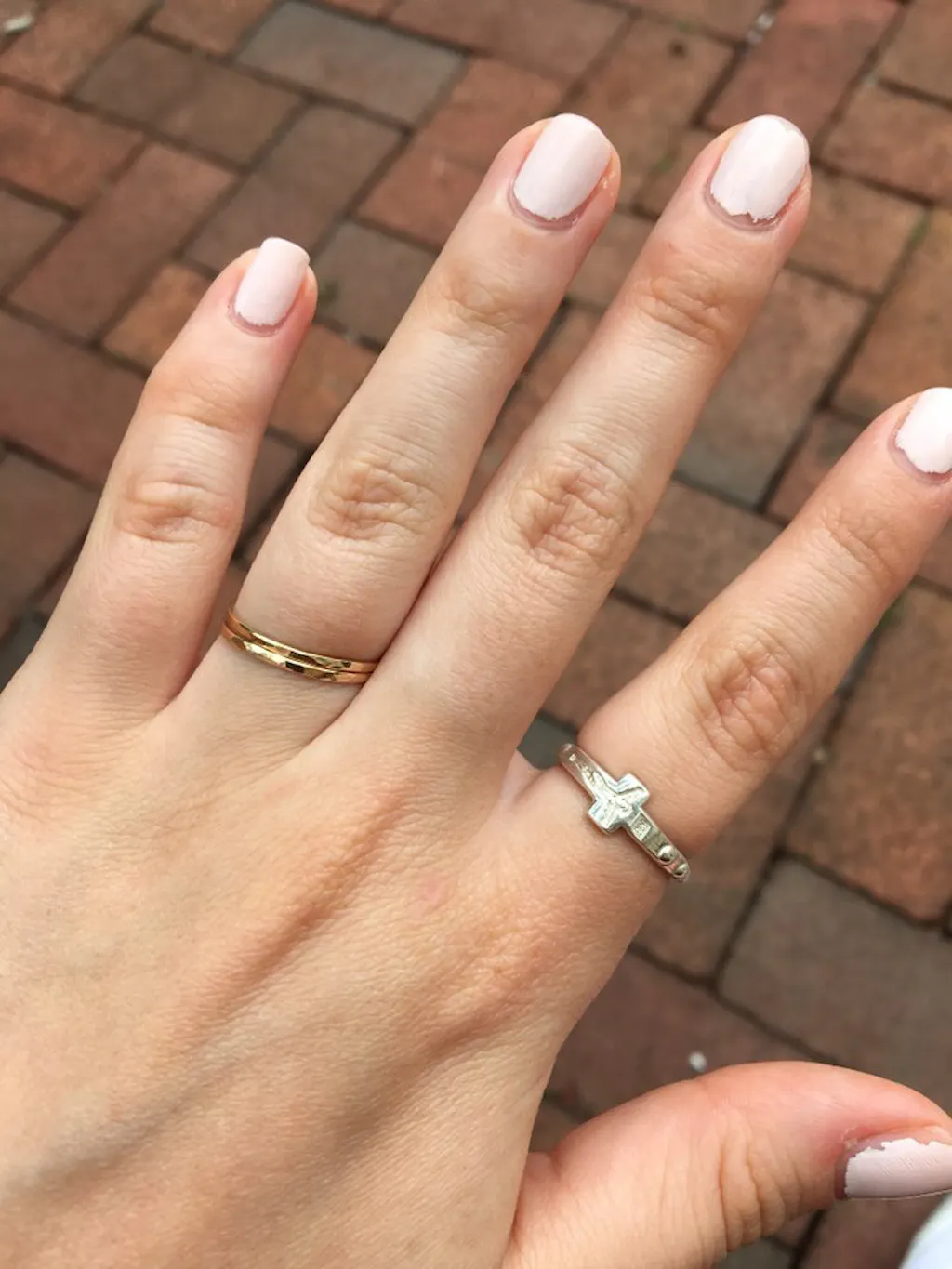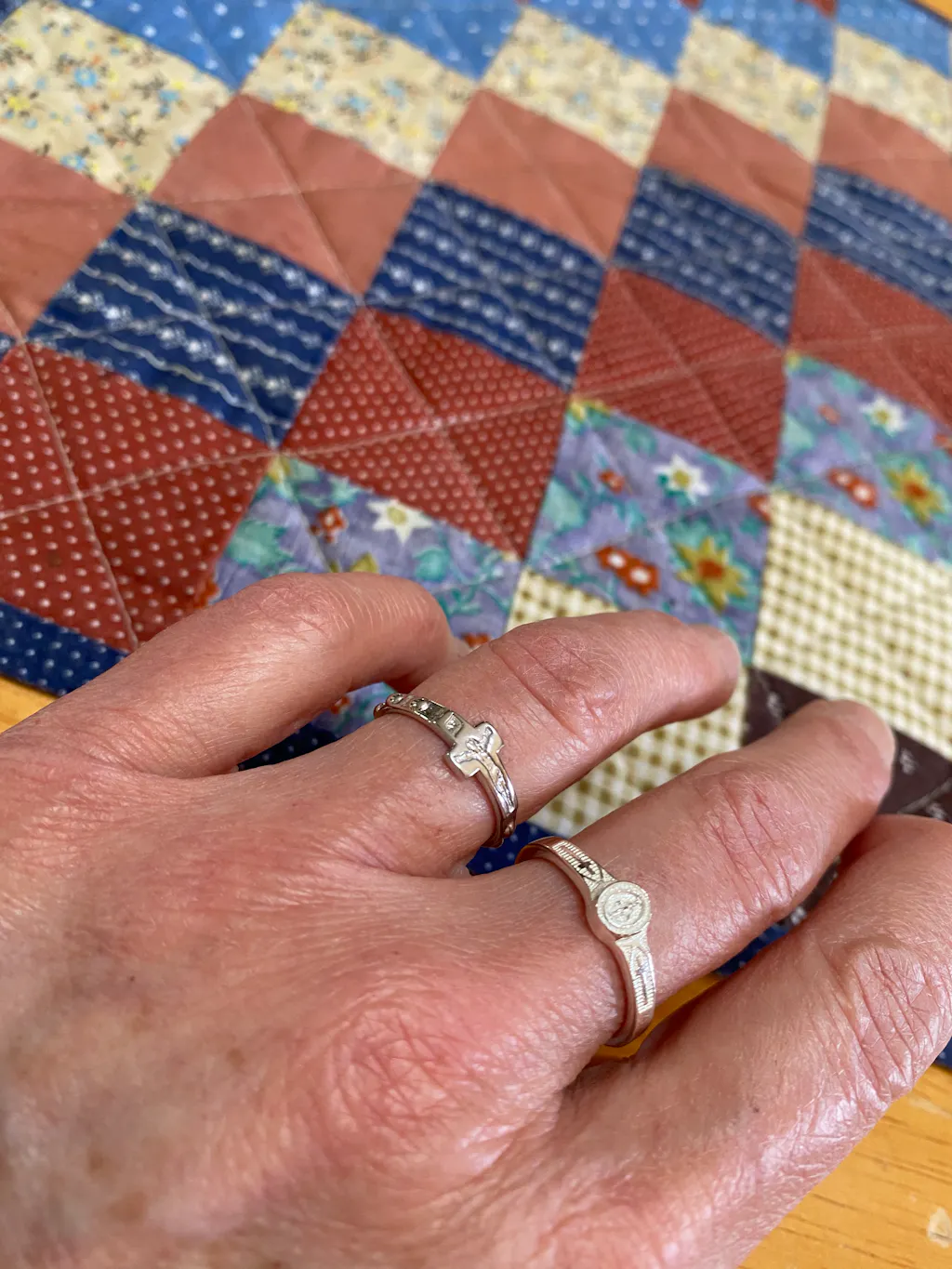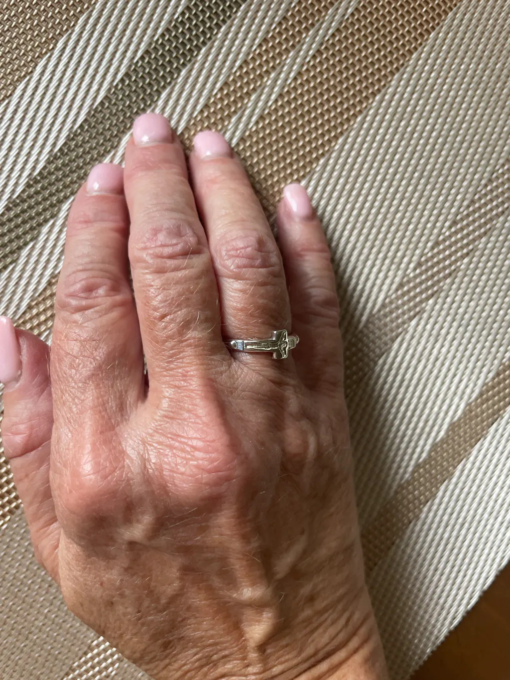 A close-up of a light-skinned hand wearing the Rosary Ring, a sterling silver cross-shaped ring, on the index finger against a soft white fabric background.